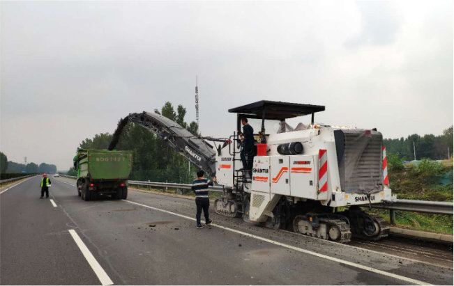京臺(tái)高速擴(kuò)建工程,原有的高速路面一次銑刨18公分,行走速度可達(dá)8-10m/min。銑刨后路面平整度高,刮料干凈。