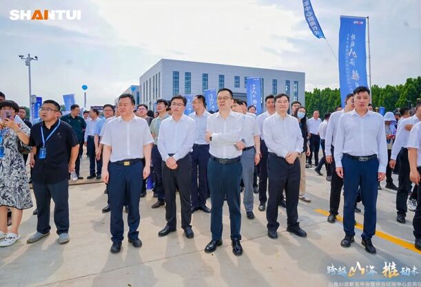 王志堅(jiān)、駱漢賓、蘇子孟、李士振及中建八局總工程師亓立剛、山推股份公司總經(jīng)理張民等領(lǐng)導(dǎo)嘉賓共同按下山推全新LOGO及AI戰(zhàn)略啟動(dòng)按鈕,宣告山推正式邁進(jìn)品牌與技術(shù)升級(jí)的新時(shí)代。