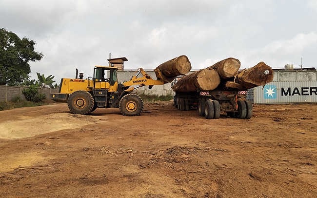 山推裝載機(jī)工作于喀麥隆某公司堆場(chǎng)及林地,裝配木料專用裝卸屬具。