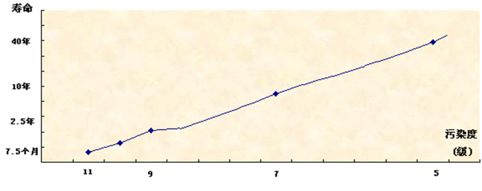 世界各研究機構(gòu)在進行研究污染度對壽命的影響時,所給出的研究結(jié)果差異很大,這主要是因為工作環(huán)境、污染物成分及顆粒硬度等因素不同的結(jié)果。一般來說(以NAS1638標準),污染度降低一級,壽命延長一倍,反之亦然。假定使用污染度為7級(NAS1638)的油液,機器的壽命為10年,同樣是這樣一臺機器將油液的污染度降低幾級,壽命就有驚人的變化。